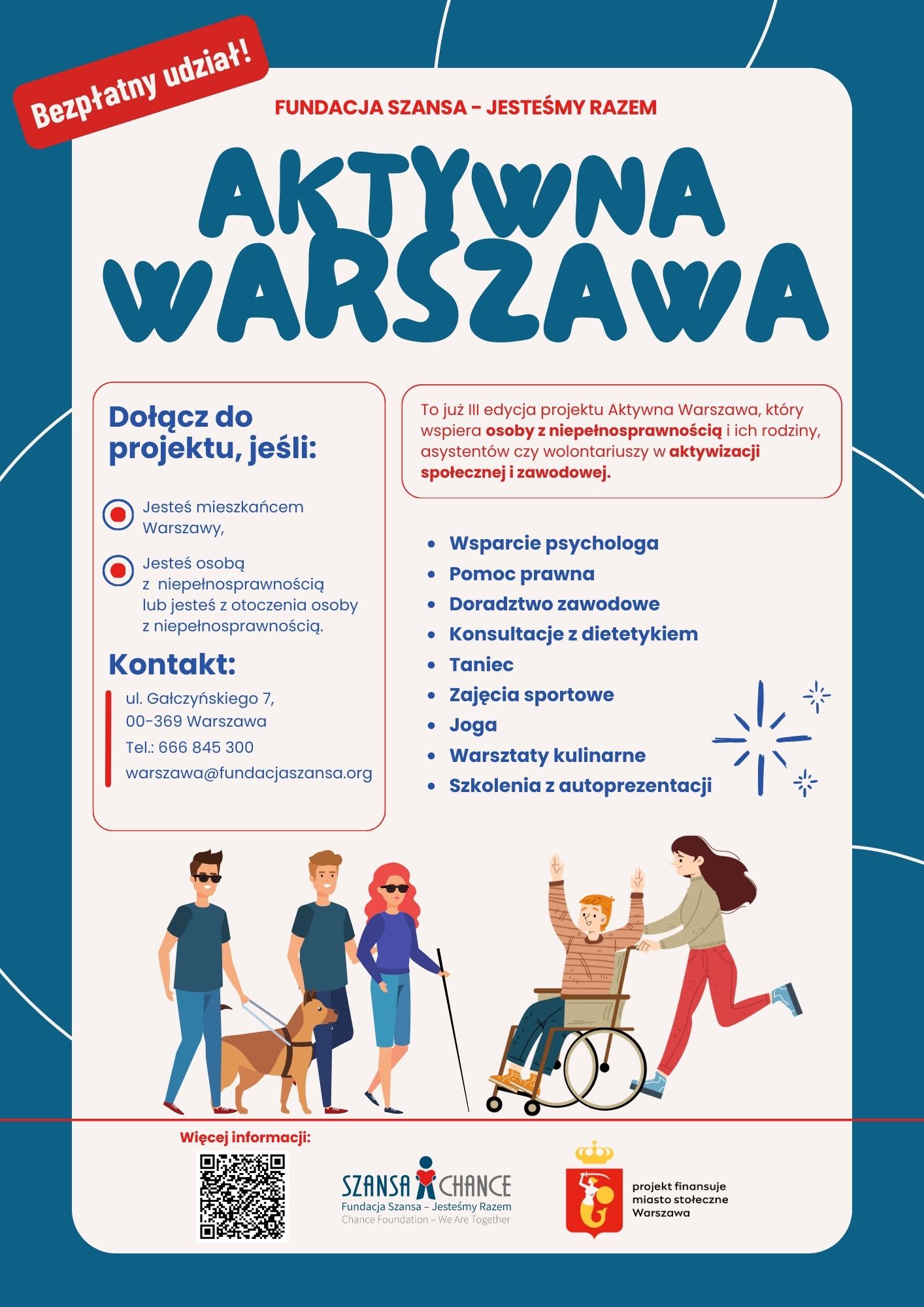Zapraszamy do udziału w projekcie pn. „Aktywna Warszawa III” finansowanym ze środków m.st. Warszawy. Celem projektu jest aktywizacja społeczna i zawodowa osób z niepełnosprawnościami.